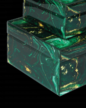 Despite looking like they are made of stone, the Interstellar Green Box Set's surfaces are the result of green swirl paper being encased in glass. The coating brings the exteriors of the decorative boxes an unparalleled sheen. The interiors are covered in black felt, and the small one will nest into the large one. Because these accessories are handmade, the patterns will vary.