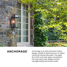 Anchorage is an early American lantern design crafted of solid aluminum to reflect a bold yet refined silhouette. The Aged Zinc or Light Oiled Bronze finish and clear glass complement the long clean lines, elegant arched carriage handle and sturdy knobs, resulting in a vintage style with classic charisma.