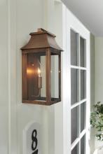 Beautiful copper lanterns in a patina finish. Sturdy rivets and a faux handle adorn the well-made and well-worn traveler's lantern. Clear glass panes complete the antique look of these welcoming wall-lanterns.