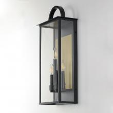 The Manchester series is inspired by classic coach lanterns and consists of minimally extended sconces in a variety of sizes that have been modified with simplified embellishments. The black frames have been modified with a squared arc handle and a contras