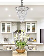 Like the sun setting on a frozen lake, this collection shimmers with tiers of icy crystals reflecting the soft glow of the candelabras. True to its Nordic namesake, the cascades of royal-cut clear crystals complement the etched antique-Silver-finished frame. Suspended by an elegantly looped chain that draws the eye to the cool sheen below.